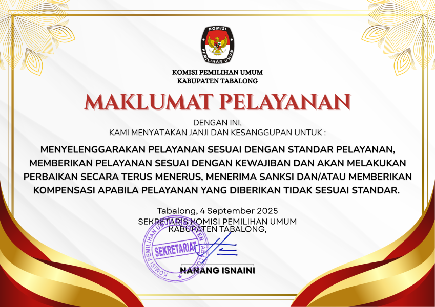 #TemanPemilih Sebagai bentuk komitmen dalam meningkatkan kualitas layanan publik, Komisi Pemilihan Umum (KPU) Kabupaten Tabalong menetapkan Maklumat Pelayanan pada tanggal 4 September 2025. Melalui maklumat ini, KPU Kabupaten Tabalong menegaskan kesanggupan untuk menyelenggarakan pelayanan sesuai prosedur operasional standar, melakukan perbaikan berkelanjutan, serta memberikan kompensasi dan penerimaan sanksi apabila pelayanan tidak sesuai dengan standar yang telah ditetapkan. Dengan penetapan maklumat ini diharapkan KPU dapat semakin memperkuat kepercayaan masyarakat terhadap kinerja KPU, sekaligus mendorong terciptanya pelayanan yang transparan, profesional, dan berintegritas demi terwujudnya penyelenggaraan pemilu yang berkualitas. ....