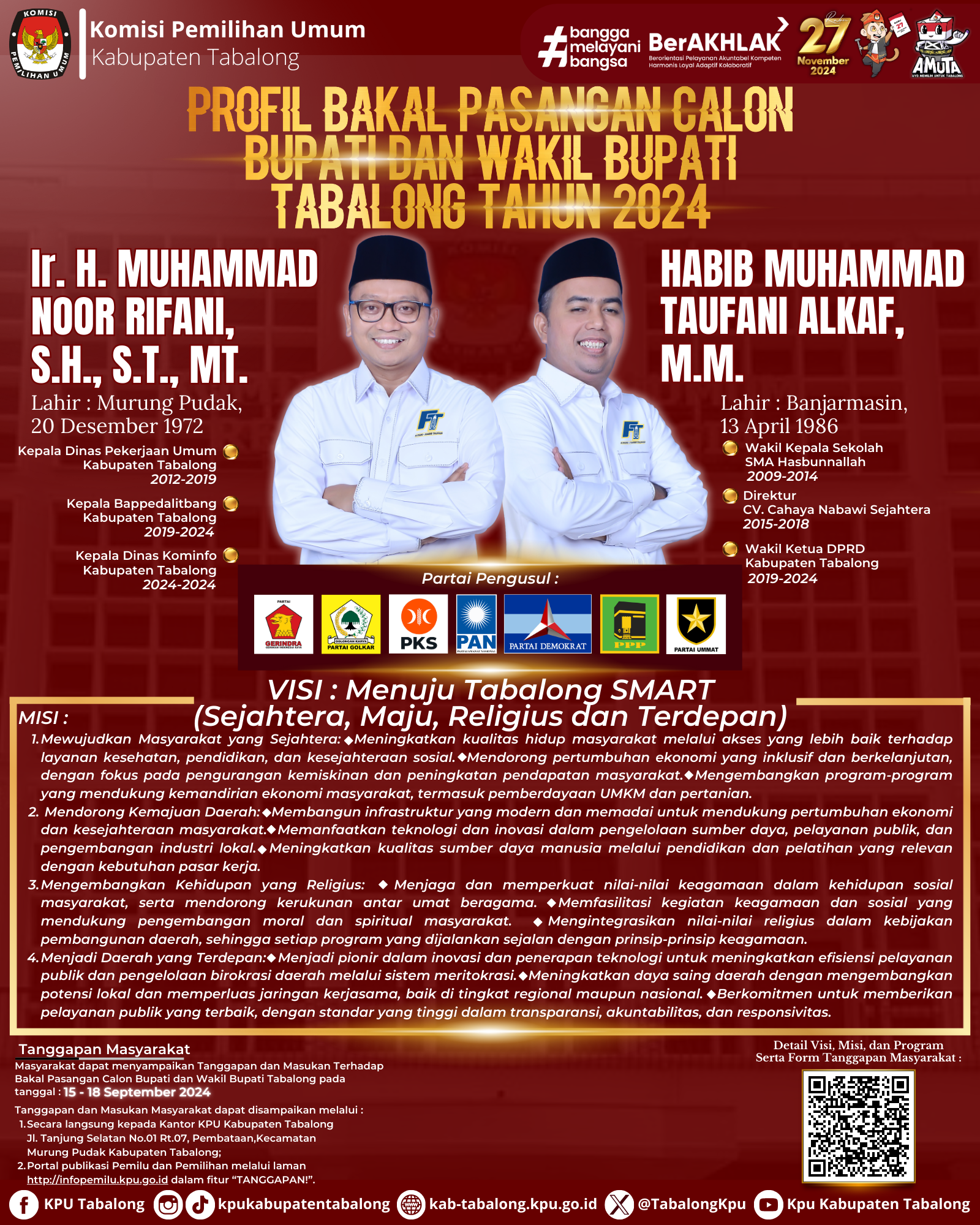 Masyarakat dapat memberikan Tanggapan dan Masukan atas Calon dan/atau Pasangan Calon Bupati dan Wakil Bupati Tabalong pada Pemilihan Bupati dan Wakil Bupati Tabalong tahun 2024 melalui :